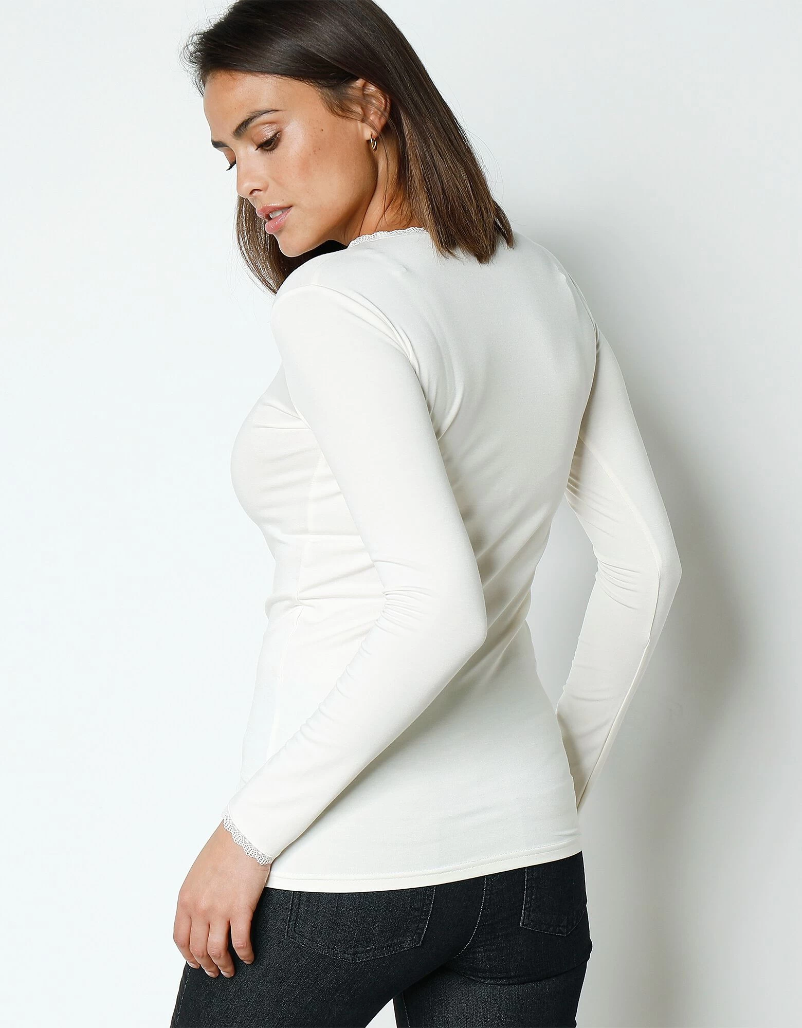– Léger col V souligné d’une fine dentelle
